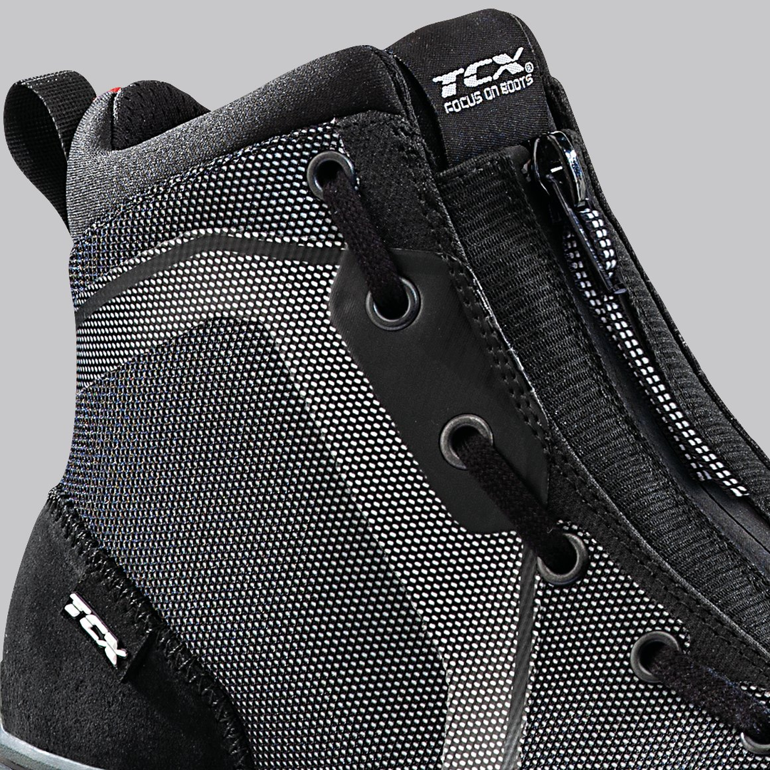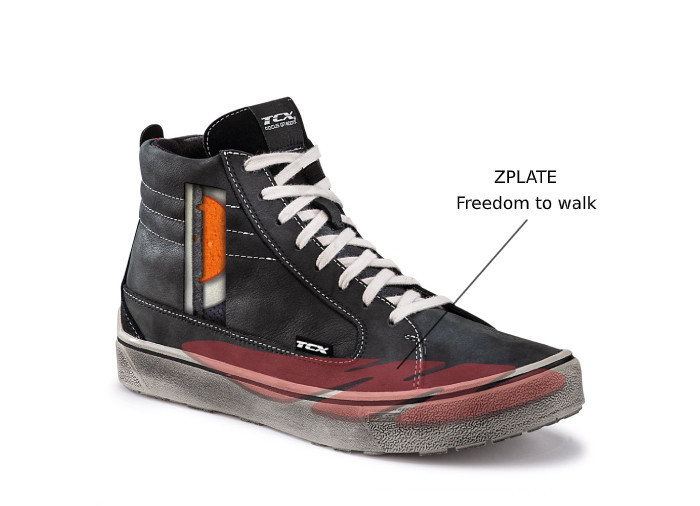 TCX scarpe Ikasu waterproof Robusto lateralmente, flessibile frontalmente. L'inserto ZPLATE nell'intersuola mantiene la giusta flessibilità della scarpa, per un comfort ottimale durante la guida e nella camminata, garantendo allo stesso tempo la corretta rigidità trasversale a protezione del piede, nel caso questo restasse sotto il veicolo in caso di caduta.