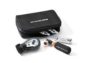Il set da viaggio nella pratica custodia include un piccolo misuratore digitale per il controllo pressione degli pneumatici e cartucce di CO 2 per il riempimento.